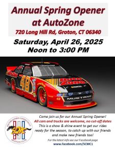 Spring is here! come on down to Auto Zone in Groton for the SCMC season opener and catch up with family and friends and most of all show off your sweet rides. Everyone welcome. Event starts at noon and runs until 3 pm.